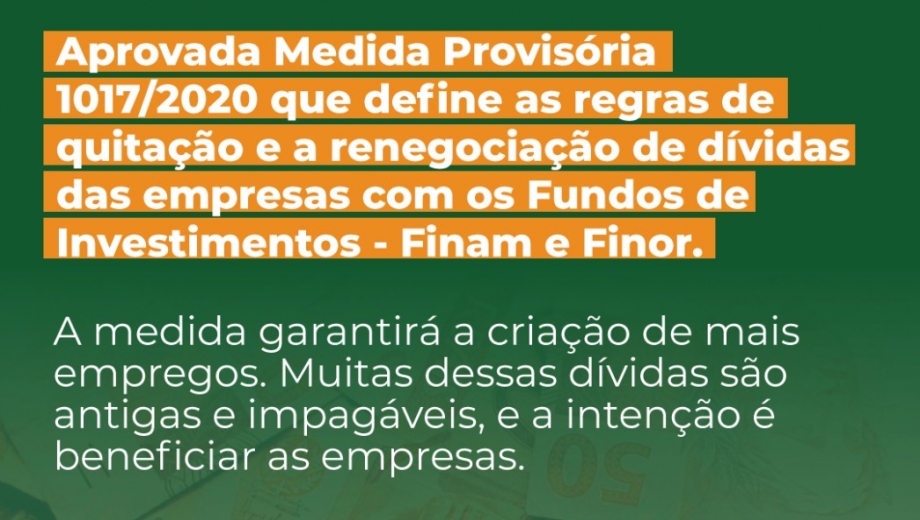 Aprovação da MP 1017/2020 permite quitação e renegociação de dívidas com o Finam e Finor