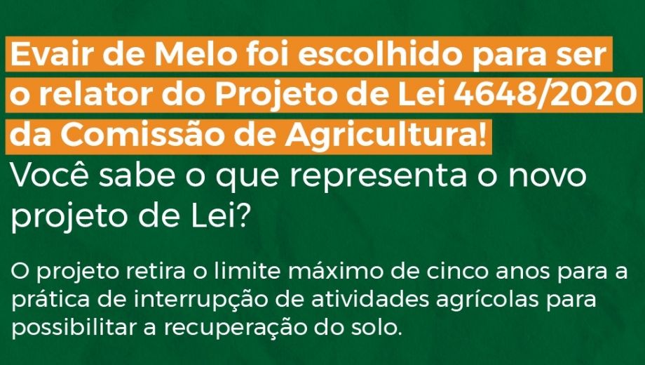 Deputado Evair de Melo é escolhido como relator de PL que altera prazos de definição de área rural ou pousio