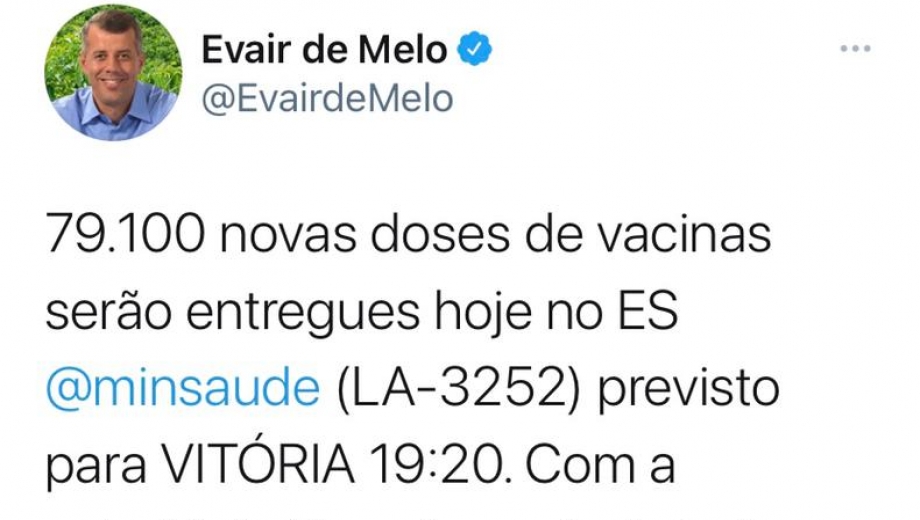 Evair de Melo acompanhou a chegada de 79 mil doses de vacina ao Espírito Santo