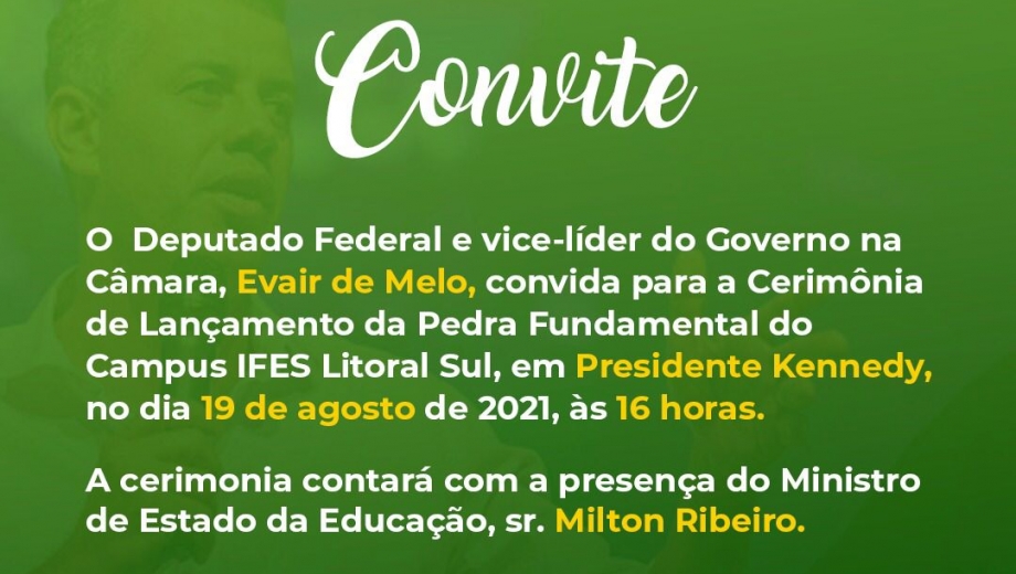Cerca de dois meses após sua primeira visita ao estado, o ministro da Educação, Milton Ribeiro, visitará novamente o Espírito Santo. O ministro virá ao estado no dia 19 de agosto para o lançamento da pedra fundamental do Instituto Federal do Espírito Santo (Ifes) que será construído em Presidente Kennedy.
