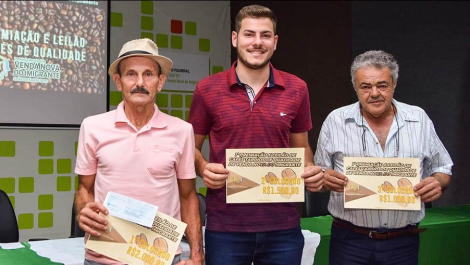 A Prefeitura de Venda Nova do Imigrante, em parceria com o Ifes, realizou nesta quarta-feira (11) a 1ª Premiação e Leilão de Cafés Tardios de Qualidade do Município. O grande vencedor foi o produtor Pedro Tonolli, seguido por Dério Brioschi e José Luiz Mauro, que receberam prêmios de R$ 2 mil, R$ 1.500,00 e R$ 1 mil, respectivamente. Com uma proposta diferente de anos anteriores o novo formato ainda garantiu aos 10 finalistas a comercialização dos cafés no leilão.
