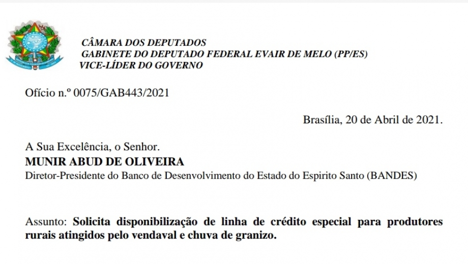 Evair de Melo solicita ao BANDES linha de crédito extra aos produtores rurais atingidos pelas chuvas de granizo