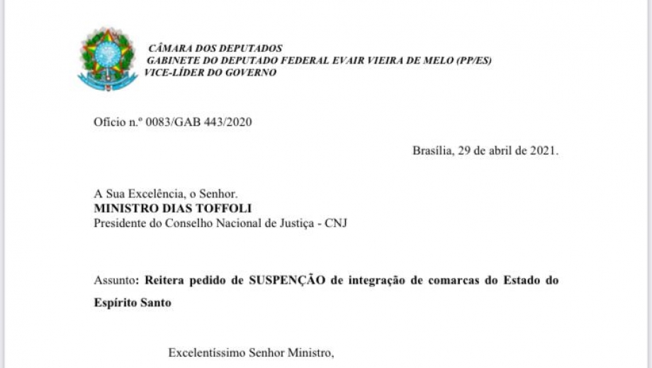 Evair de Melo solicita ao CNJ a suspensão da integração de 28 comarcas no Espírito Santo
